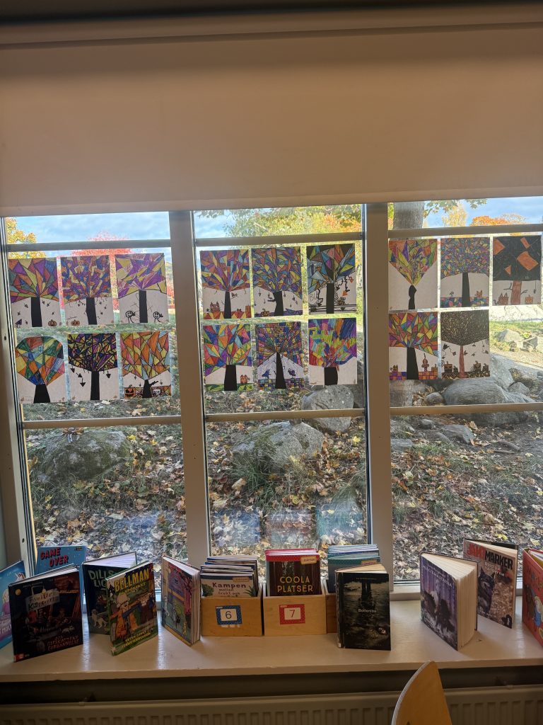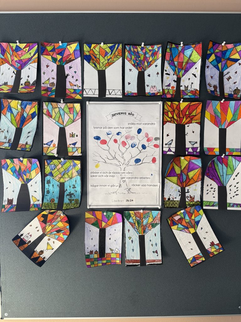 På bilden har vi bland annat arbetat med en kreativ bilduppgift som vi kallat Triangelträd. Med hjälp av linjaler, tuschpennor och fantasi skapade eleverna färgstarka konstverk fyllda av geometriska former. Eleverna övade på finmotoriken genom att arbeta noggrant med linjal men också på de geometriska begrepp som trianglar, symmetri och form.