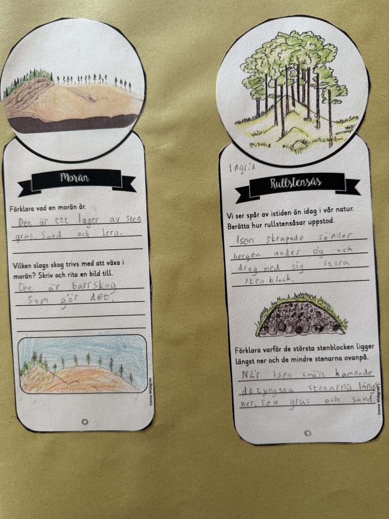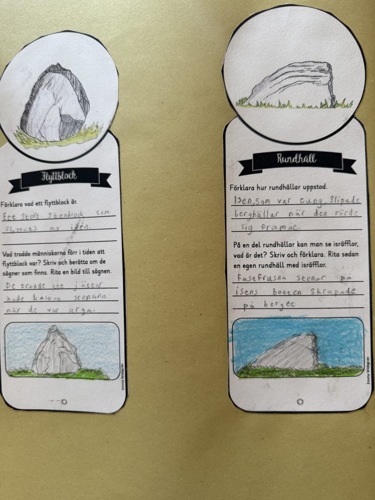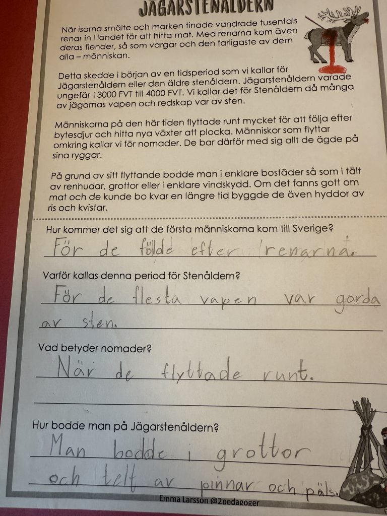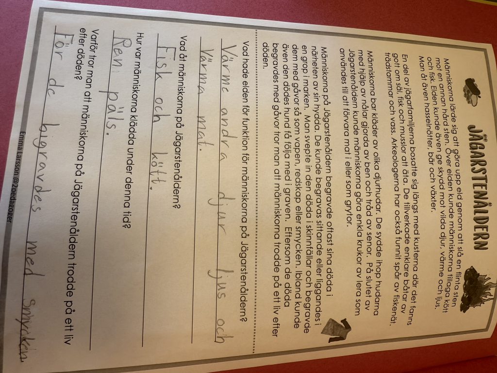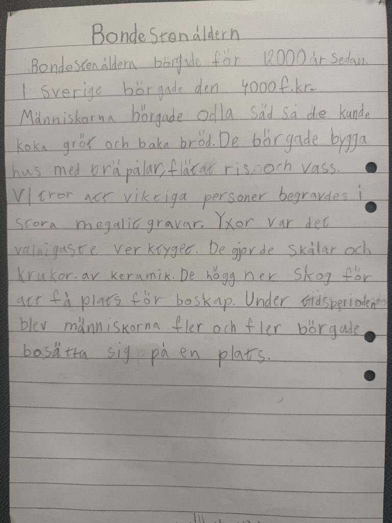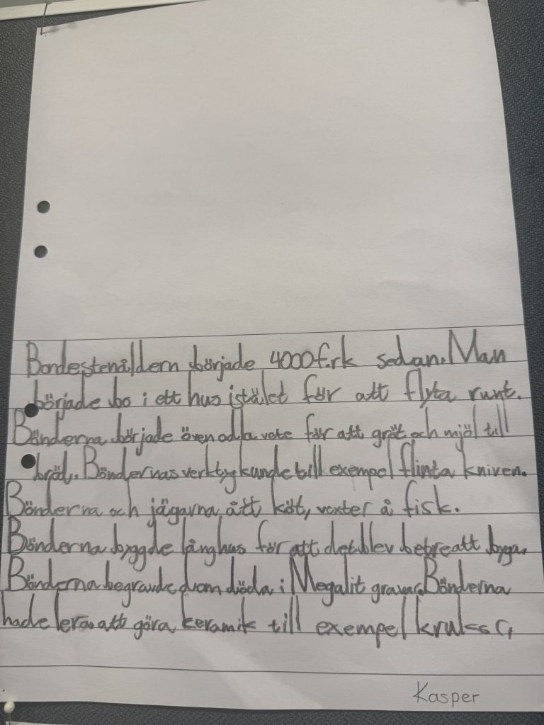 Arbetet har sedan förts vidare till jägarstenåldern, där vi har lärt oss om hur djur och människor började vandra in i Norden i takt med att isen smälte. Vi har tittat på filmer, läst faktatexter och skrivit egna texter om både jägarstenåldern och bondestenåldern. I klassrummet har vi haft många spännande samtal om likheter och skillnader mellan dessa två tidsepoker – hur människorna levde, vad de åt och hur deras liv förändrades när de gick från att vara jägare till att bli bönder. Nu ser vi fram emot att lära oss mer om bronsåldern och järnåldern.