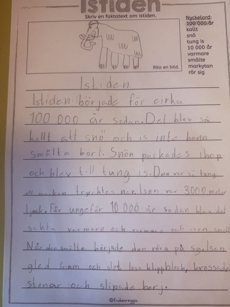 I projektet kring temat forntiden har vi hunnit med att arbeta med istiden och stenåldern. Med hjälp av pedagogiska filmer och faktatexter började vi med att ta reda på varför istider uppstår, när den senaste inträffade och hur länge den varade. Det väckte stor fascination att tänka sig att Sverige en gång varit täckt av ett tre kilometer tjockt istäcke som pressade ner marken! Vi har också lärt oss känna igen spår från istiden i naturen, till exempel rullstensåsar, flyttblock, jättegrytor och rundhällar. Spår som format vårt landskap och som fortfarande går att se omkring oss idag. Intresset har varit stort, särskilt kring de utdöda djuren från den här tiden, inte minst mammuten.